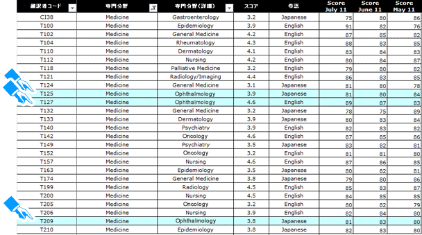 翻訳者データベースの中から、眼科専門の候補者を探します。原稿との適合性や翻訳者の直近の成績などを管理するツールを使い、データ解析の手法を用いて翻訳者選びを行います。>>翻訳者の採用基準については採用審査へ